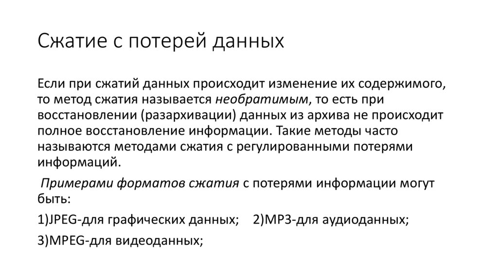 Чаще всего встречается в форматах изображений, видео и аудио, где нет необходимости в идеальном представлении исходного медиа. MP3 и JPEG — два популярных примера. Но сжатие с потерями не совсем подходит для файлов, где важна вся информация. Например, в текстовом файле или электронной таблице оно приведёт к искажённому выводу.