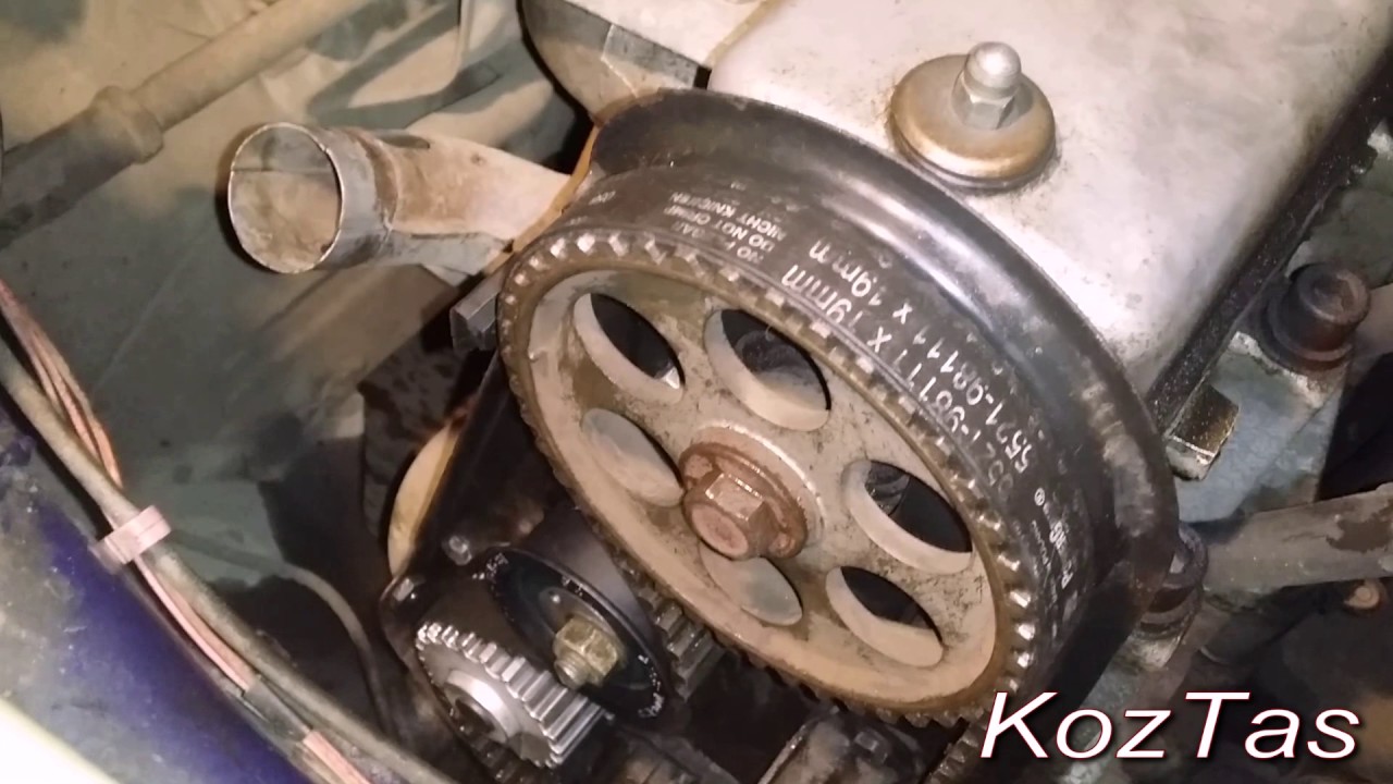 Нам надо снять ремень ГРМ, так как помпа приводится им. Прежде, чем снимать ремень, надо выставить по меткам распредвал и коленвал. Вот метка распредвала: