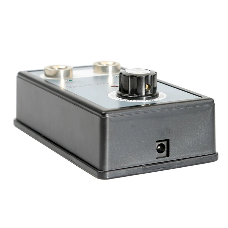 Сам тестер, это пластиковая коробка с 3 индикаторами работы, 2 отверстиями для установки свечи зажигания, а так же регулятора напряжения.