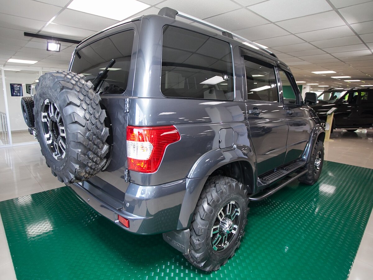 Задняя часть автомобиля выгодно выделяется благодаря контейнеру запасного колеса с серебристой надписью PATRIOT и современным задним фонарям.