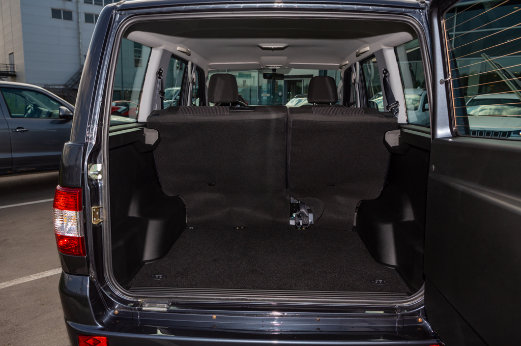 УАЗ Патриот отличается своими внушительными размерами, которые дают преимущество в объеме полезного пространства в салоне. Вместительное багажное отделение объемом 1130 литров (до потолка) может быть увеличено до внушительных 2415 литров со сложенными сиденьями второго ряда, что позволяет перевозить крупногабаритные вещи.