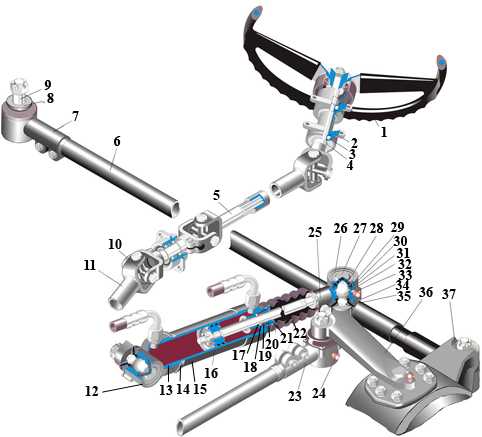 1 – Рулевое колесо; 2 – корпус подшипников вала; 3 — подшипник; 4 – вал колеса рулевого управления; 5 – карданный вал рулевого управления; 6 – тяга рулевой трапеции; 7 — наконечник; 8 — шайба; 9 – палец шарнирный; 10 – крестовина карданного вала; 11 – вилка скользящая; 12 – наконечник цилиндра; 13 – кольцо уплотнительное; 14 – гайка наконечника; 15 — цилиндр; 16 –поршень со штоком; 17 – кольцо уплотнительное; 18 – кольцо опорное; 19 — манжета; 20 – кольцо нажимное; 21 — гайка; 22 – муфта защитная; 23 – тяга рулевой трапеции; 24 — масленка; 25 – наконечник штока; 26 – кольцо стопорное; 27 — заглушка; 28 – пружина; 29 – обойма пружины; 30 – кольцо уплотнительное; 31 – вкладыш верхний; 32 – палец шаровый; 33 – вкладыш нижний; 34 — накладка; 35 – муфта защитная; 36 – рычаг поворотного кулака; 37 – корпус поворотного кулака.