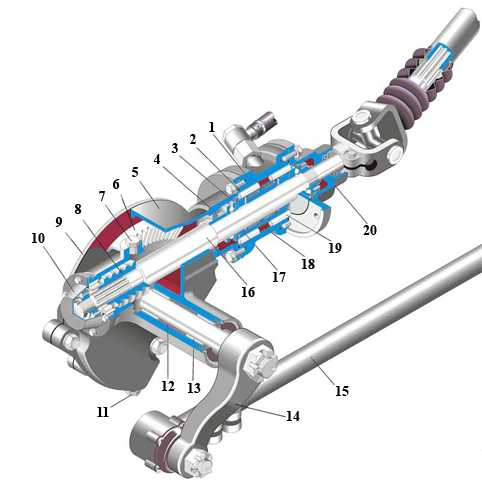 1 – корпус золотника; 2 – кольцо уплотнительное; 3 – кольцо плунжеров подвижное; 4 — манжета; 5 – картер рулевого механизма; 6 — сектор; 7 – пробка заливного отверстия; 8 — червяк; 9 – боковая крышка картера; 10 — крышка; 11 – пробка сливного отверстия; 12 – втулка распорная; 13 – игольчатый подшипник; 14 – сошка рулевого управления; 15 – тяга сошки рулевого управления; 16 – вал рулевого механизма; 17 — золотник; 18 — пружина; 19 — плунжер; 20 – крышка корпуса золотника.