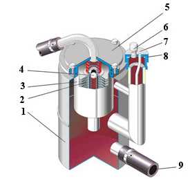 Бак масляный. 1 – Корпус бачка; 2 — фильтр; 3 – корпус фильтра; 4 – клапан перепускной; 5 — крышка; 6 — сапун; 7 – пробка заливной горловины; 8 — кольцо; 9 – шланг всасывающий.