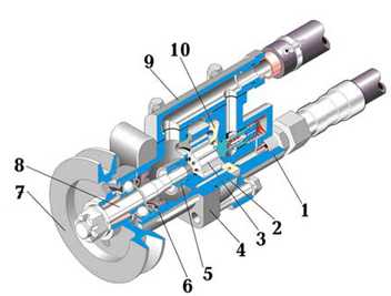 Насос усилительного механизма. 1 – крышка насоса; 2 — статор; 3 — ротор; 4 — корпус; 5 – игольчатый подшипник; 6 — проставка; 7 — шкив; 8 — валик; 9 — коллектор; 10 – диск распределительный.
