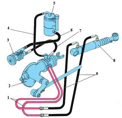 Принципиальная схема. 1 – трубопроводы високого давления; 2 – механизм рулевой; 3 – насос усилительного механизма; 4 – шланг сливной; 5 – бак масляный; 6 – шланг всасывающий; 7 – шланг нагнетательный; 8 – механизм усилительный; 9 – шланги.