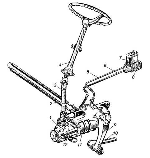 1 — корпус клапана управления гидроусилителем; 2 — радиатор; 3 — карданный вал; 4 — рулевая колонка; 5 — трубопровод низкого давления; 6 — трубопровод высокого давления; 7— бачок гидросистемы; 8— насос гидроусилителя; 9 — сошка; 10 — продольная тяга; 11 — рулевой механизм с гидроусилителем; 12 — корпус углового редуктора.