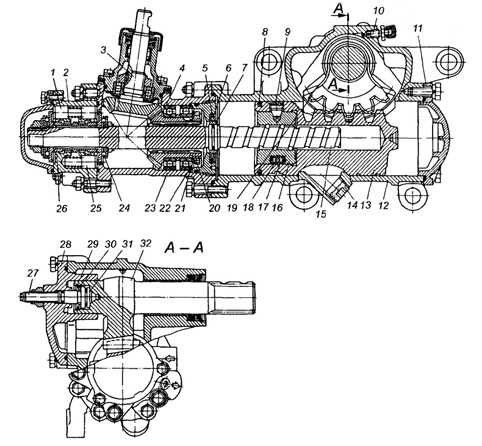 1 — реактивный плунжер; 2— корпус клапана управления; 3 — ведущее зубчатое колесо; 4 — ведомое зубчатое колесо; 5, 22 и 29— стопорные кольца; 6 — втулка; 7 и 31 — упорные колы к», 8 — уплотнительное кольцо; 9 и 15 — бинты; 10 — перепускной клапан; 11 и 28 — крышки; 12 — картер; 13 — поршень-рейка; 14 — пробка; 16 и 20— гайки; 17 — желоб; 18 — шарик; 19 — сектор; 21 — стопорная шайба; 23 — корпус; 24 — упорный подшипник; 25 — плунжер; 26 — золотник; 27— регулировочный винт; 30— регулировочная шайба; 32— зубчатый сектор вала сошки.