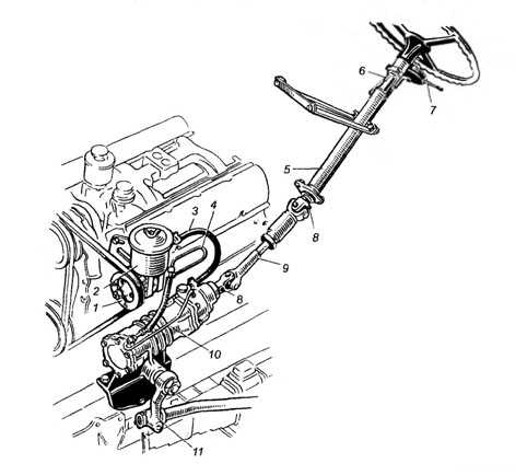 1 — насос гидроусилителя; 2 — бачок насоса; 3 — шланг низкого давления; 4 — шланг высокого давления; 5 колонка; 6 — контактное устройство сигнала; 7 — переключатель указателей поворота; 8 карданный шарнир; 9 — карданный вал; 10 — рулевой механизм; 11 — сошка.