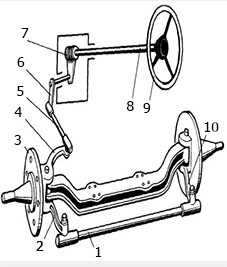 1 — поперечная тяга; 2 — нижний рычаг; 3 — поворотная цапфа; 4 — верхний рычаг; 5 — продольная тяга; 6 — сошка рулевого привода; 7 — рулевая передача; 8 — рулевой вал; 9 — рулевое колесо.
