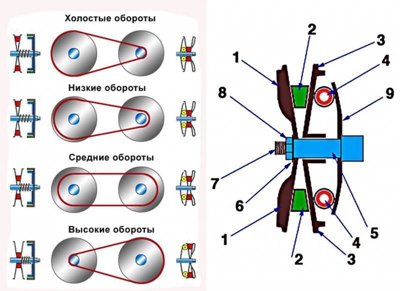 Чаще всего встречающийся в современных автомобилях клиноременной вариатор отличается в деталях от описанной схемы, но принцип, лежащий в основе данных устройств — общий: плавное изменение передаточного числа путём изменения диаметра приводного шкива.