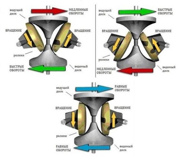 Валы вариатора соосны. Ролики вращаются на осях, не лежащих в плоскости роликов, благодаря чему разность окружных скоростей в крайних точках площадки касания значительно уменьшена. Для выравнивания нагрузки на ролики оси их закреплены в плавающей раме 3. Валы разгружены от изгибающих моментов, так как ролики взаимно уравновешены. Фрикционные диски (чашки) прижимаются к роликам клиновым механизмом 2, расположенным на ведомом и ведущем валах. Клиновой механизм, состоящий из двух шайб с канавками переменной глубины и шариков, предназначен для уменьшения проскальзывания как при пуске (предварительное прижатые дисков к роликам осуществляется пружиной, встроенной в вал и давящей на клиновой механизм), так и при толчках, воспринимаемых вариатором от приводной машины, а также для обеспечения жесткой характеристики передачи.