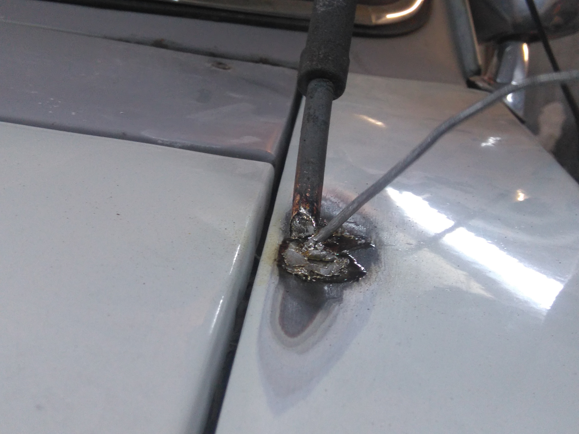 1. Для начала работ необходимо точно подобрать цвет материалов для подкраски, для мелкого малярного ремонта — это крайне важный момент, иначе пятно отличающееся от основного цвета будет очень заметно. В случае глубокого и давнего скола, его необходимо обработать преобразователем ржавчины, а затем тщательно вымыть и обезжирить ацетоном или спиртом.
