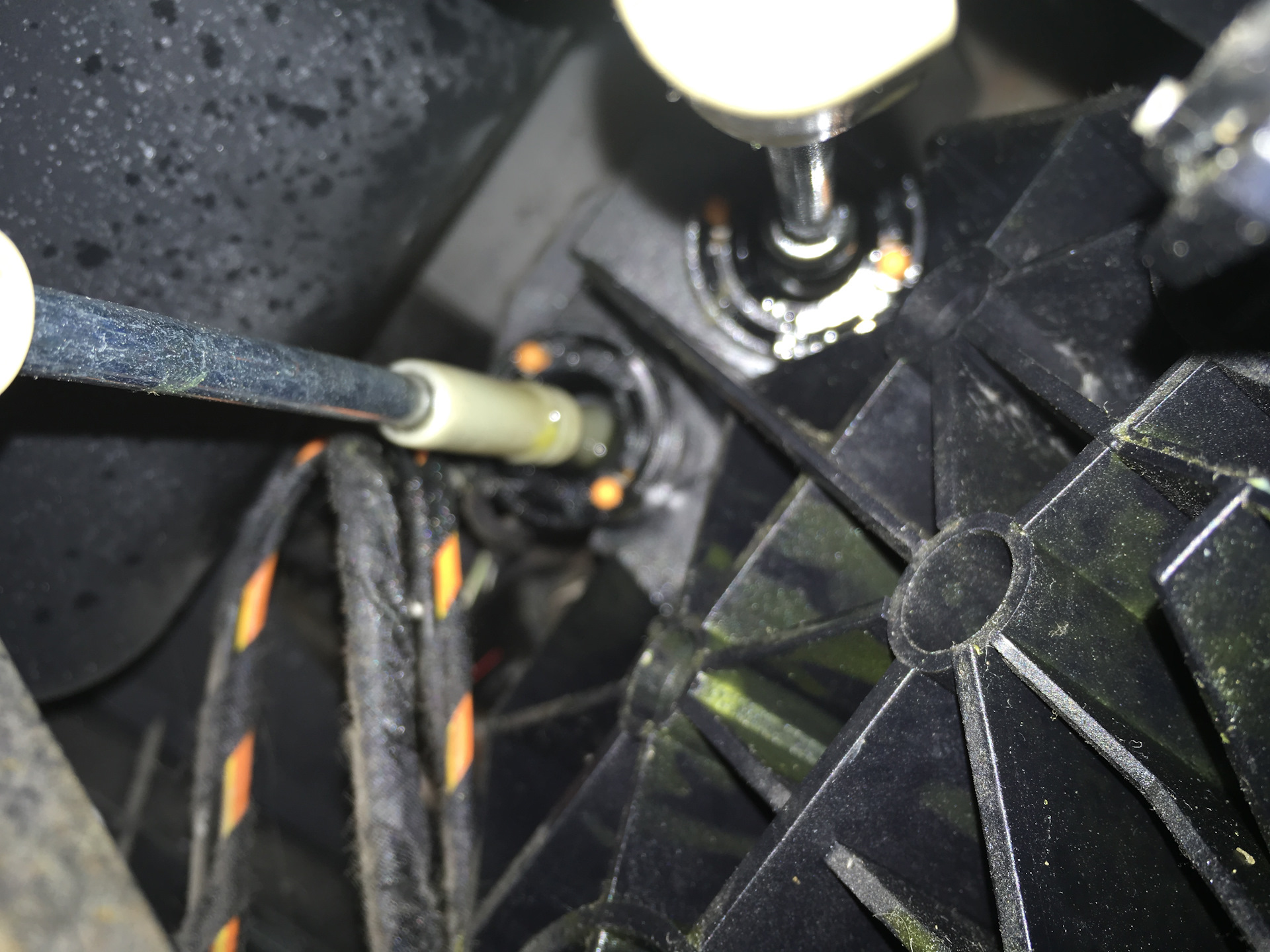 1. Отщёлкиваем тросики широкой отвёрткой. Для тросика выбора передач, дополнительно нажимал при отщёлкивании на круглую пипку. Вроде без проблем снялись.