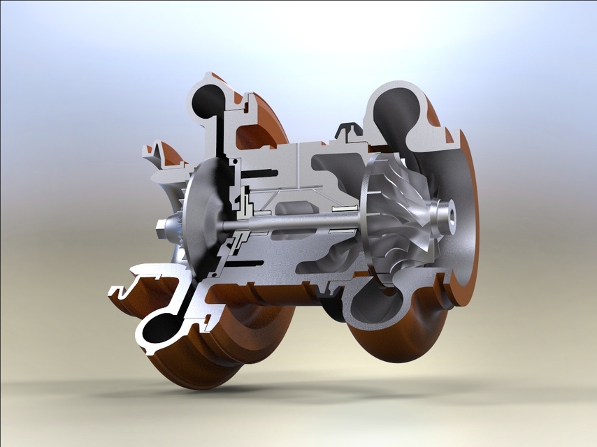 Турбина состоит из двух улиток — улитки компрессора, через которую всасывается воздух и нагнетается во впускной коллектор, и улитки горячей части, через которую проходят выхлопные газы вращая колесо турбины и выходят в выхлопной тракт. Из крыльчатки компрессора и крыльчатки горячей части. Из шарикоподшипникового картриджа. Из корпуса, который соединяет обе улитки, держит подшипники, так же в корпусе находится охлаждающий контур.