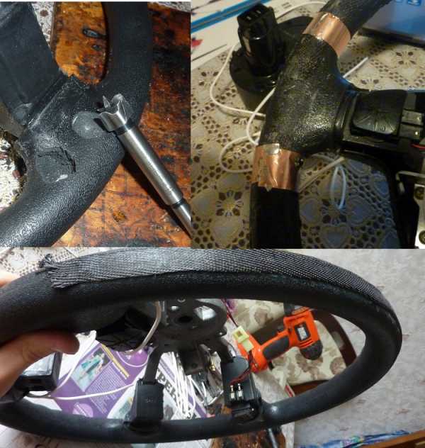 Но в этом случае мы получим провод в ПВХ изоляции толщиной 1.5-2мм, что хорошо с точки зрения надежности, но очень усложняет работу по перетяжке в кожу. Единственное решение вырезать аккуратно канавки в руле (что само по себе уже достаточно трудоемко), уложить в них греющий провод и заполнить оставшиеся неровности герметиком либо эластичной шпаклевкой. Можете выбрать этот вариант, если Вы упорный по природе и у Вас много свободного времени.