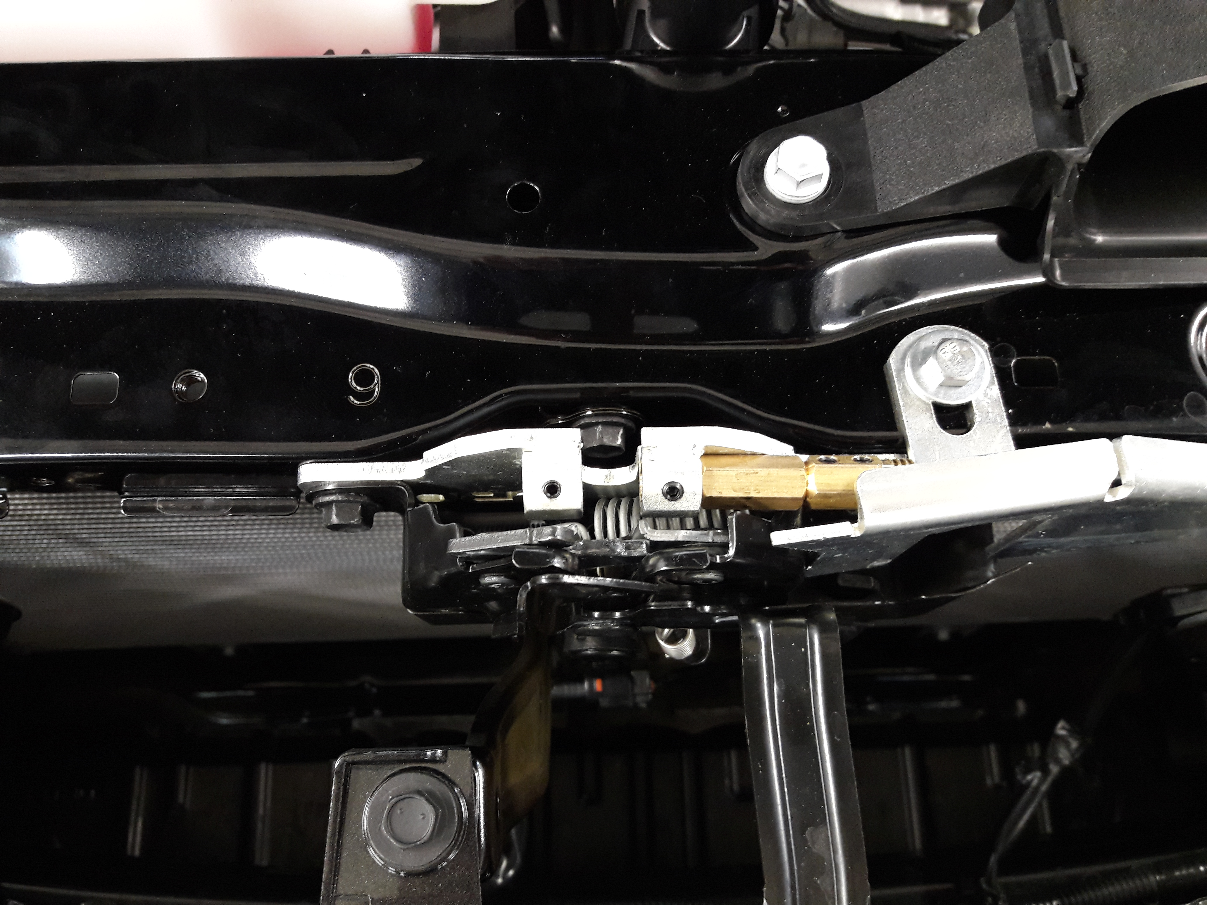 Не сходите с ума с рычагами на болтах с внутренним шестигранником. Вы можете легко снять эти маленькие болты, что означает еще один поход в хозяйственный магазин. Под капотом вы можете увидеть результаты всей своей тяжелой работы. При планировании размещения защелок учитывайте архитектуру под капотом. Резка нескольких слоев металла может быть проблематичной. Стержень имеет резьбу и двойные гайки, поэтому вы можете регулировать высоту стержня вверх и вниз, чтобы найти идеальную посадку. Эта часть требует немного терпения и нескольких переделок. В конце концов, вы найдете золотую середину, где капот закрывается идеально. Когда закончите, у вас будет красивый запорный механизм, который улучшает аэродинамику и гарантирует, что ваш капот останется закрытым. Мы добавили ярко-оранжевые наклейки со стрелками, чтобы люди, которые не знакомы с механизмом Works будет знать, где нажать на защелку, чтобы открыть ее. Вторая и более важная причина заключается в том, что если водитель видит две оранжевые стрелки, указывающие вверх на передней части капота, он знает, что капот не заперт.