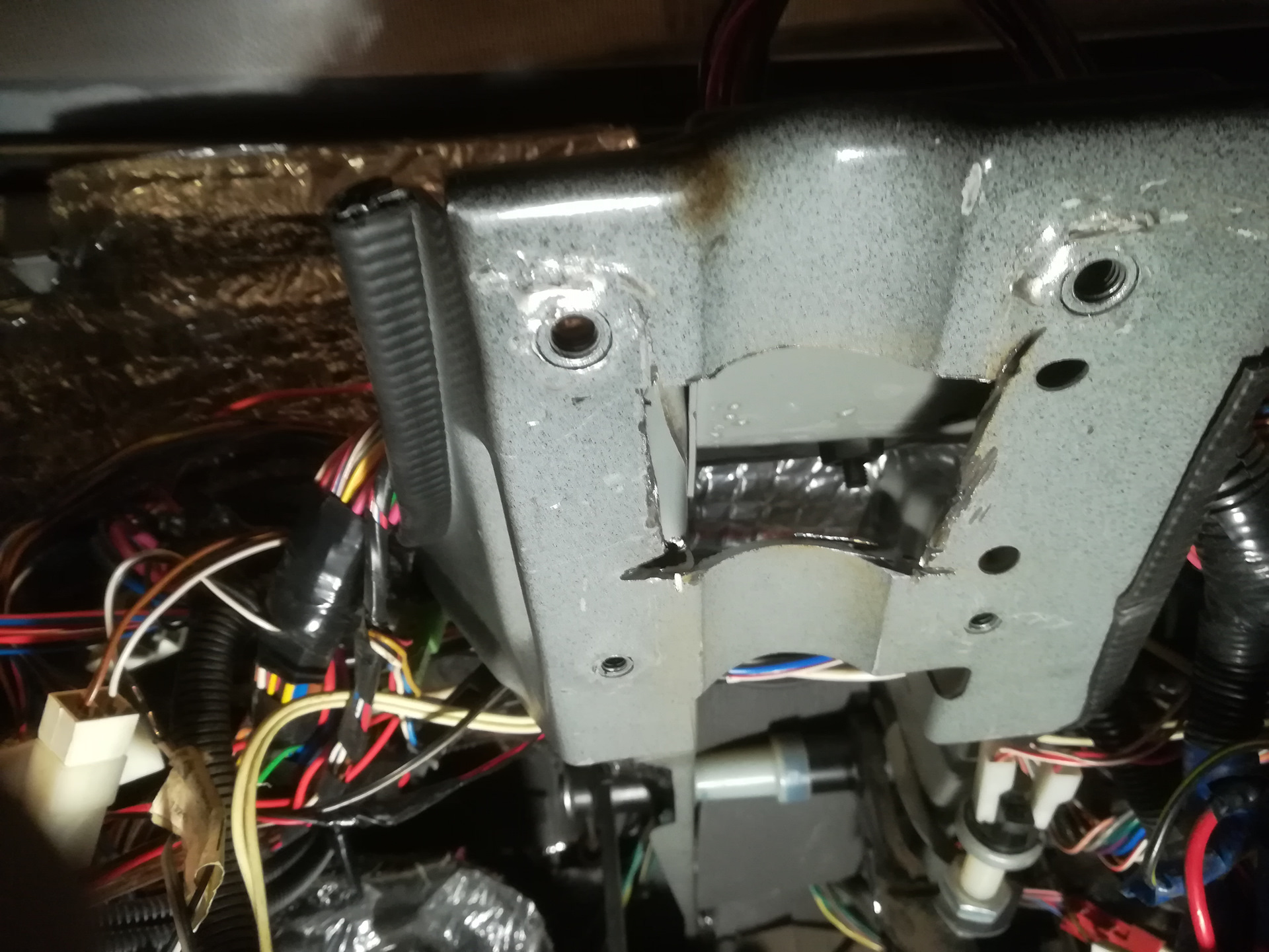 4. Кабель ДС протягивается рядом с тросиком спидометра и заводится в салон через то же отверстие в тоннеле. Под днищем кабель закрепили также за трос спидометра обыкновенными пластмассовыми электромонтажными хомутиками. Ушло 4 штуки.