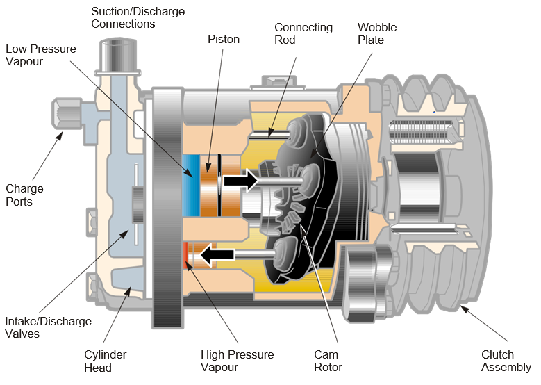 Поскольку компрессор является основным потребителем энергии климатической системы, в его задачи входит самая трудоёмкая часть работы – создание требуемого давления в системе. Кроме того, согласно законам термодинамики, молекулы сжимаемого газа нагреваются, и под воздействием давления газ переходит в жидкое состояние. Строго говоря, возможность изменения агрегатного состояния хладагента и является тем основополагающим принципом, который лежит в основе данного способа охлаждения нагнетаемого из салона тёплого воздуха.