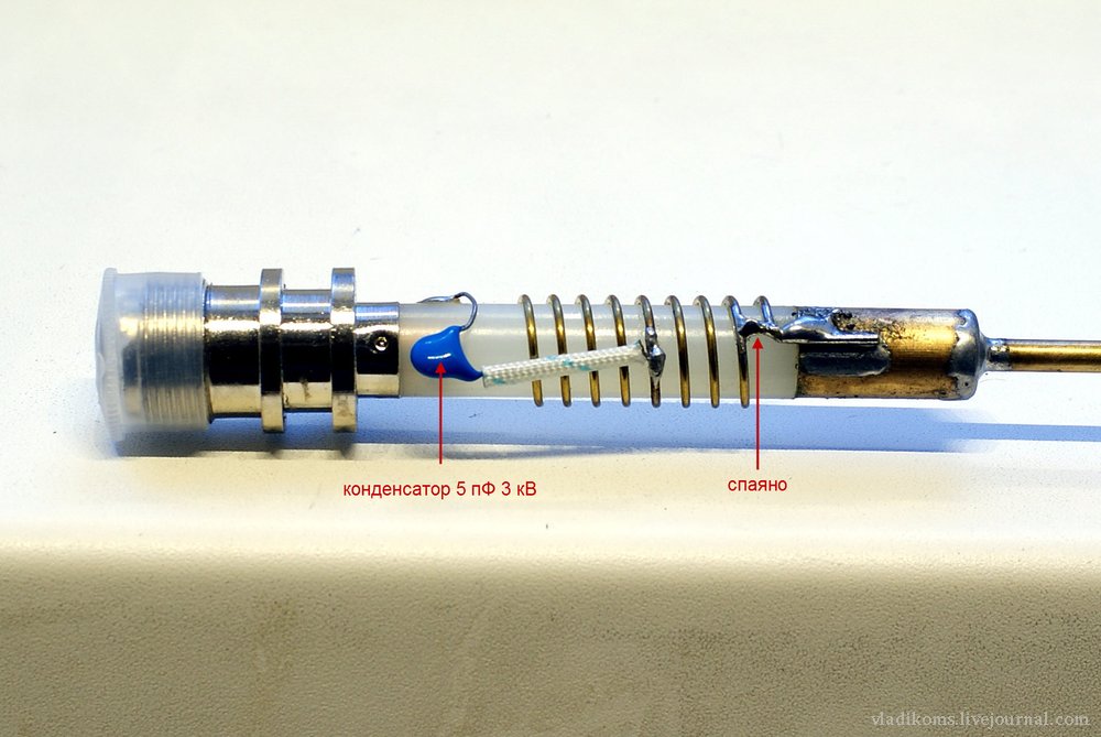 - Посередине стекла вертикально идут к центру два провода, где крепится ровно по оси подстроечный конденсатор (5 – 25 пф). Длиной 45 см каждый. Поэтому придется свить зигзагом, уложить под изоляционную трубку.