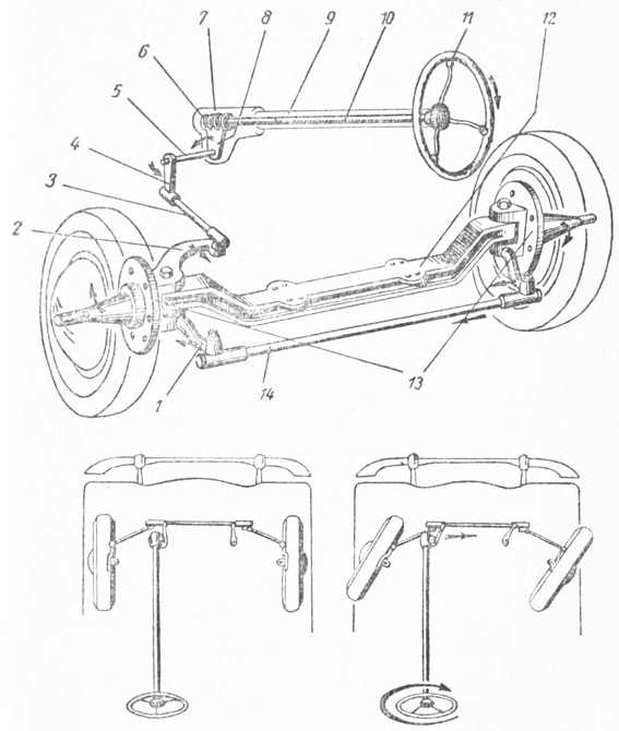 Схема зависимой подвески подразумевает жесткое крепление системы колесо – балка – кузов. В современных моделях автомобилей применяют независимую подвеску, в этом случае каждое колесо имеет собственную схему крепления к кузову и пружинистый элемент. - Рулевое управление – комплекс механизмов, предназначенных для изменения направления передвижения автомобиля. Усилие водителя передается через рулевое колесо на рулевой механизм, далее на рулевой привод и непосредственно, на сами колеса.