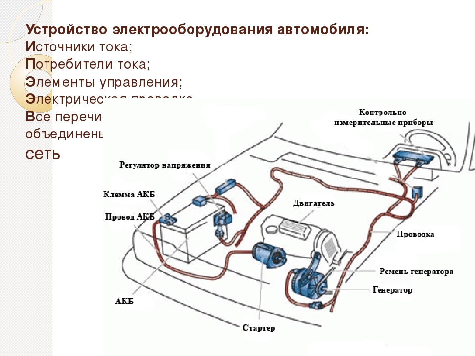 - Электрооборудование – комплекс узлов и механизмов, предназначенных непосредственно для запуска автомобиля, работы некоторых электроприборов и освещения. Также современный автомобиль трудно себе представить без охранной сигнализации. Источником электроэнергии служит аккумуляторная батарея, которая постоянно заряжается и накапливает энергию во время движения через генератор. Схема электрооборудования в машинах довольно сложна для понимания новичков.