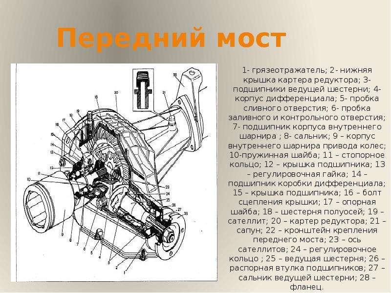- Трансмиссия – это промежуточный механизм, который понижает крутящийся момент двигателя, и передает на колеса. Существует около 5 видов трансмиссии. В состав трансмиссии входят: сцепление, коробка передач, главная передача, раздаточный механизм, дифференциал, карданная передача и шарнир угловых скоростей.