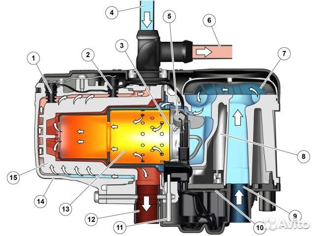 Компоновка отопителя «двухэтажная» — внизу расположено основное устройство с камерой сгорания и теплообменников, вверху — бак для топлива и топливный насос.