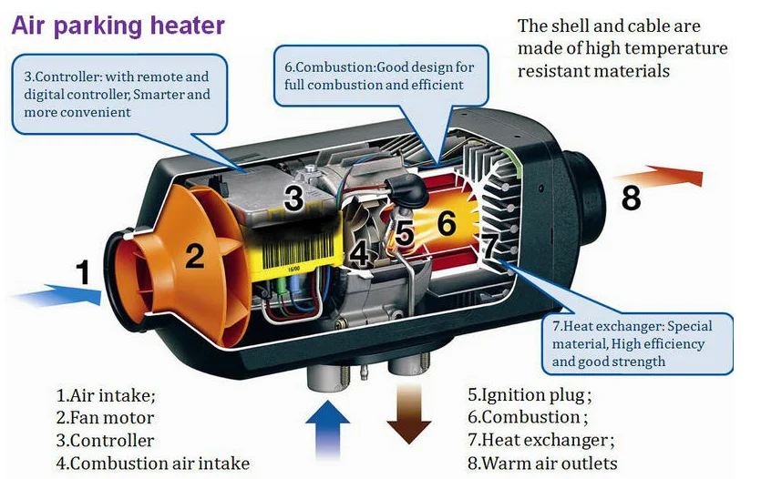 Представляет собой устройство компактный автономный блок с камерой сгорания, теплообменником, баком для горючего, а также встроенным контроллером. Предусмотрено управление топливным насосом, контроль свечой накаливания, вентилятором теплообменника, а также температурные сенсоры.