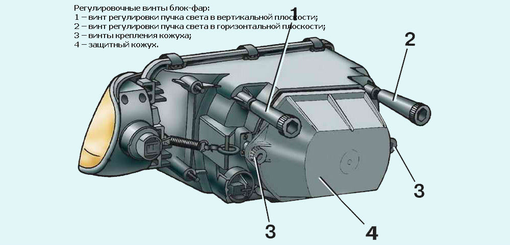 - Регулировочные винты — расположены на задней части фары, необходимы для регулировки света фар.