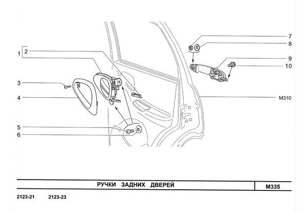 Замок, защелка и привод замка левой двери: 1 — Пружина; 2 — Ось ограничителя; 3 — Облицовка ручки; 4 — Внутренняя ручка; 5 — Корпус ручки; 6 — Тяга; 7 — Ограничитель; 8 — Розетка; 9 — Кнопка; 10 — Тяга кнопки; 11 — Рычаг механизма запирающего; 12 — Корпус; 13 — Щеколда; 14 — Наружная ручка; 15 — Пружина; 16 — Собачка храповика; 17 — Храповик ротора; 18 — Рычаг; 19 — Фиксатор; 20 — Сухарь; 21 — Защелка замка; 22 — Ротор; 23 — Цилиндр замка; 24 — Прокладка; 25 — Боковина кузова; 26 — Винт; 27 — Планка; 28 — Гайка; 29 — Винт нажимной; 30 — Шайба; 31 — Кнопка.