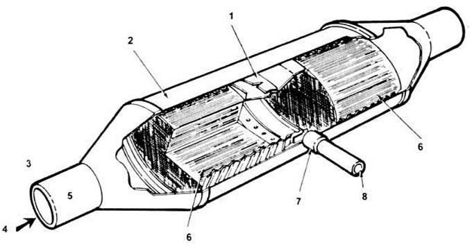 Вслед за устройством коллектора следует каталитический нейтрализатор. Данное устройство предназначается для того, чтобы обеспечивать наименьший уровень токсичности отработанных газов. Если внедриться непосредственно в структурные особенности устройства катализатора в разрезе, то можно обнаружить, что состоять оно будет из внешней оболочки, выполненной из керамики, и тонких каналов, которые располагаются на ней. Все эти каналы внутри покрываются специальным небольшим платиновым слоем. В более простых случаях платина заменяется на более редкие металлы, такие как родий или палладий.