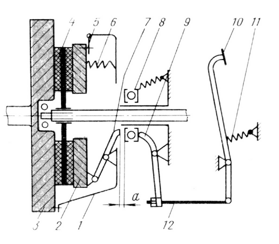 Для выключения сцепления необходимо, сжав рабочие пружины, отвести нажимной диск 4 (рис.124) от ведомого 3. Для отвода нажимного диска от ведомого на его тыльной стороне выполнены три прилива, в которых просверлены отверстия, а в них на игольчатых подшипниках установлены три рычажка 5, вторые концы которых находятся строго в одной плоскости. Каждый рычажок подвешен к кожуху сцепления с помощью опорной вилки 7 и закрепляется регулировочной гайкой. Если одновременно нажать на все рычажки, то они, поворачиваясь на опорах вилок, вторыми своими концами отведут нажимной диск от ведомого, еще больше сжав рабочие пружины, трение между дисками прекратится, ведомый диск остановится, а вместе с ним остановится и ведущий вал коробки передач. Сцепление выключится.