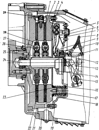 Чугунный нажимной диск 2 расположен в стальном штампованном кожухе 12, прикрепленном восемью центрирующими болтами 21 к маховику 1 двигателя.