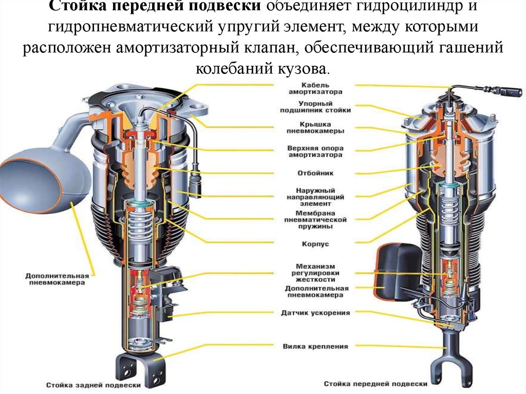 Ключевое отличие пневмоподвески – в упругом элементе. Вместо пружин и рессор здесь герметичная камера, наполняемая воздухом. Ее устанавливают на амортизатор сверху или рядом с ним. Характеристики от выбранного решения не зависят, основное внимание уделяется компоновке. Например, на «Ауди-А6» с передним приводом применялись разнесенные амортизаторы и подушки, а на той же машине с шильдиками quattro – единая пневмостойка.