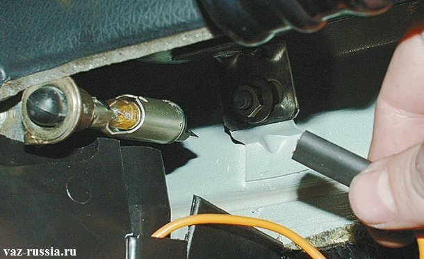 - Для тестирования вам потребуется лампа с проводами, один из ее щупов следует подключить к минусовой клемме АКБ или кузову «Шестерки».