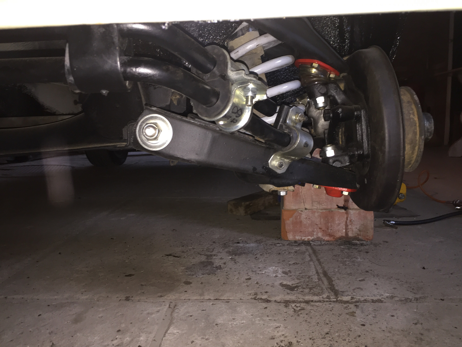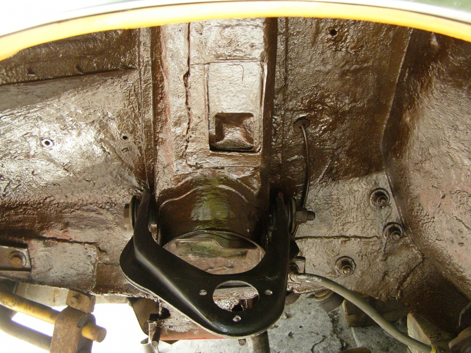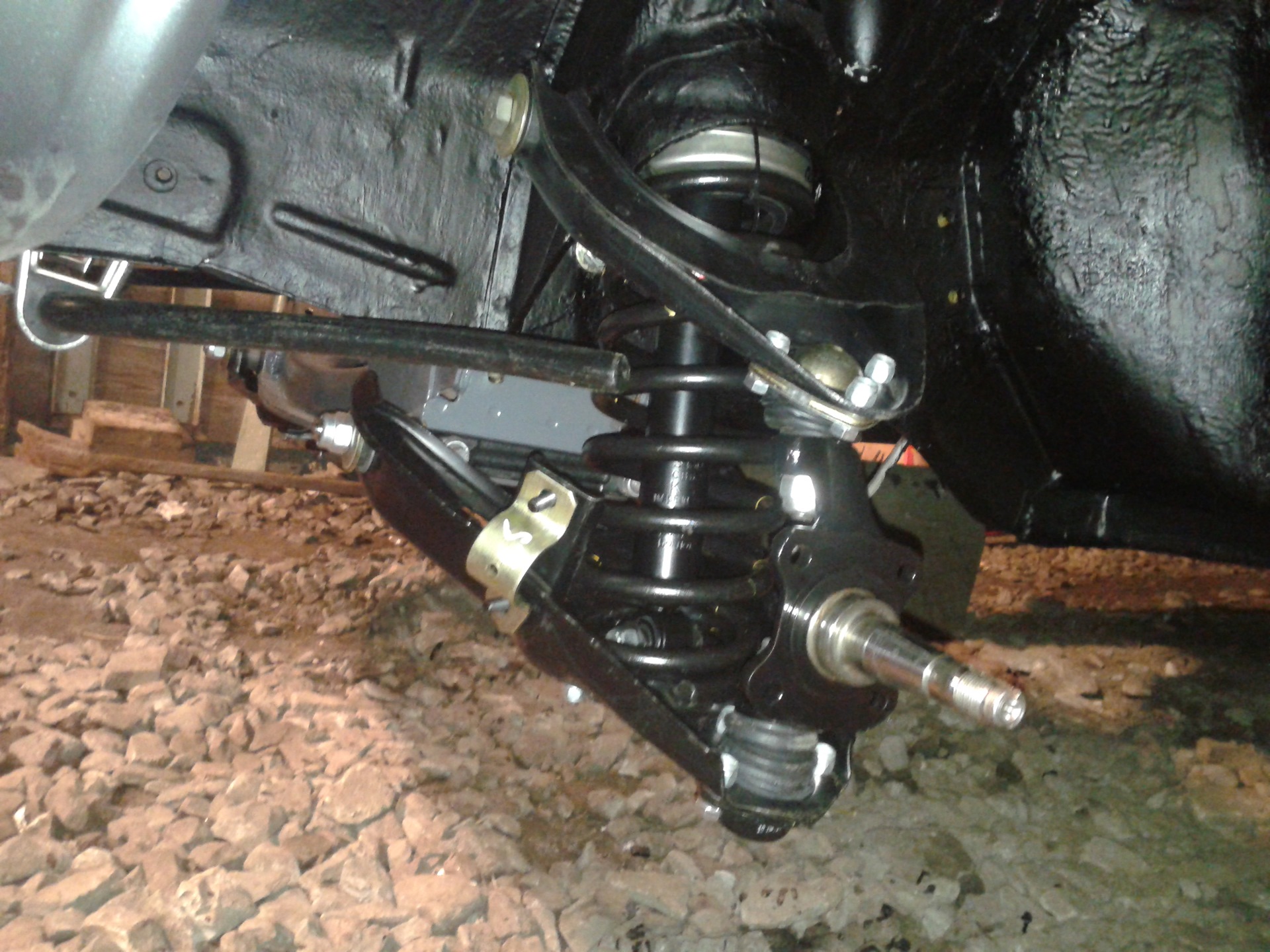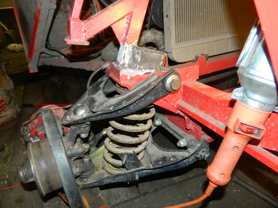 Ось нижних рычагов закреплена двумя болтами на поперечине, которая в свою очередь крепится к передним лонжеронам. Между осью и поперечиной установлены два пакета дистанционных шайб и регулировочных прокладок, задающие углы продольного и поперечного наклона оси поворота переднего колеса. Осью верхних рычагов служит болт, проходящий сквозь стойку брызговика. Рычаги на осях поворачиваются на резинометаллических шарнирах. К рычагам на шаровых шарнирах крепится поворотный кулак. На цапфе поворотного кулака на двух роликовых конических подшипниках установлена ступица колеса с тормозным диском. Гайка крепления ступицы правого колеса с левой резьбой и имеет маркировку в виде точек на торце.
