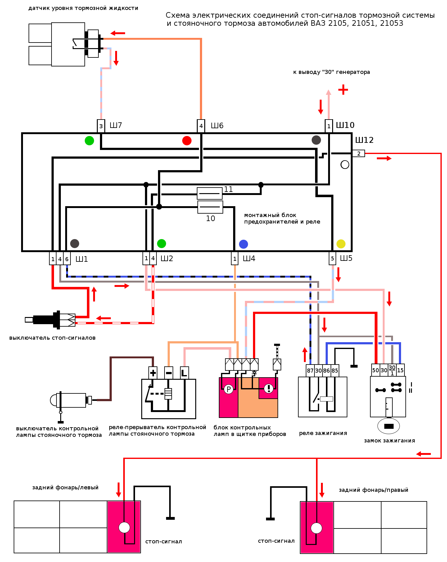 К лампам заднего света ток подается по зеленому проводу, от поперечного штекера в монтажном блоке (Ш 9 или для 2114 — X9, вывод 16), который проходит через весь салон автомобиля с левой водительской стороны. Возможно, ослабло крепление штекера, или в нем окислился наконечник провода, или где-то переломился зеленый провод. Можно вынуть штекер из монтажного блока и подать напряжение отрезком провода с АКБ на вывод 16 зеленого провода. Лампа загорелась – провод исправен, нет, ищем место повреждения или сразу меняем его на новый.
