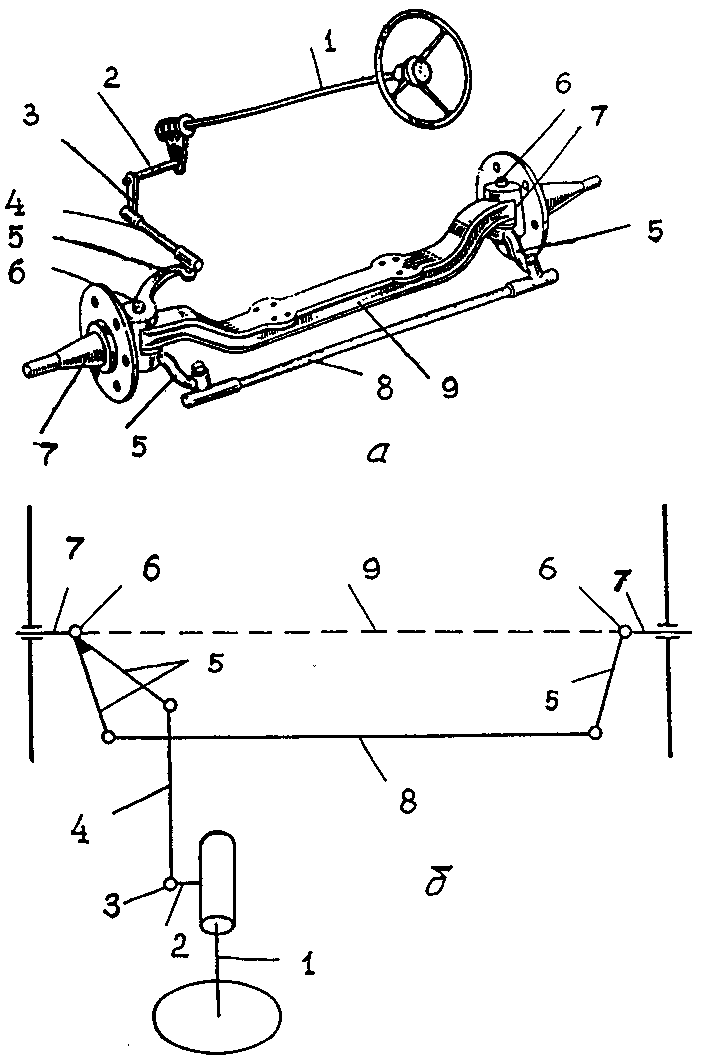 1 — поперечная тяга; 2 — левый рычаг рулевой трапеции; 3 ~ поворотный кулак; 4 — поворотный рычаг; 5 — продольная тяга; 6 ~ сошка; 7 — рулевой механизм; 8 — вал рулевого колеса; 9 — рулевое колесо; 10 — правый рычаг рулевой трапеции.