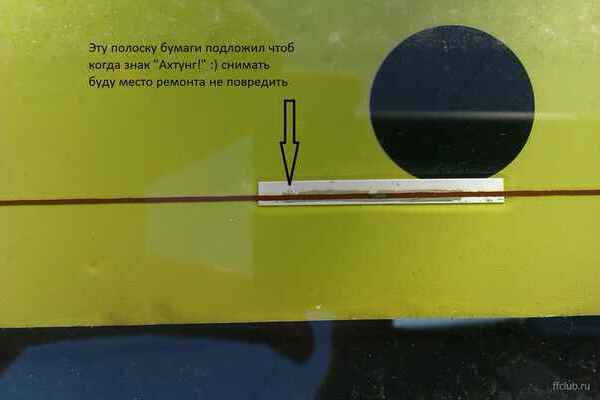 - Клеим аппликатор. В качестве альтернативы можно приклеить скотч вдоль дефектного участка нити сверху и снизу.