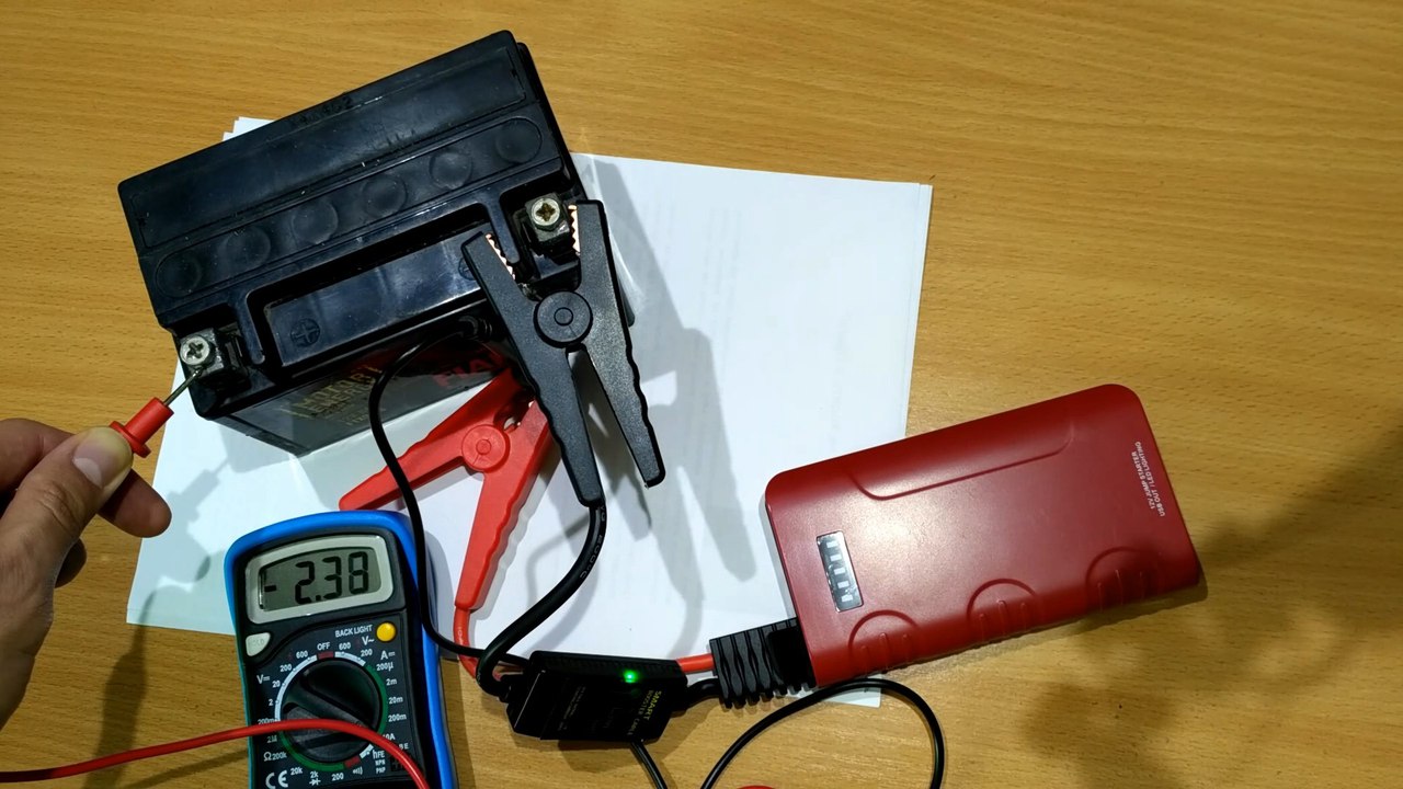 Возьмите зарядное устройство и подсоедините красный провод к положительной клемме аккумулятора, а черный — к отрицательной клемме. Переведите зарядку в медленный режим 2 А на 12 В и дайте ему постоять от 24 до 36 часов.