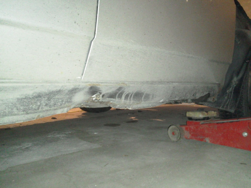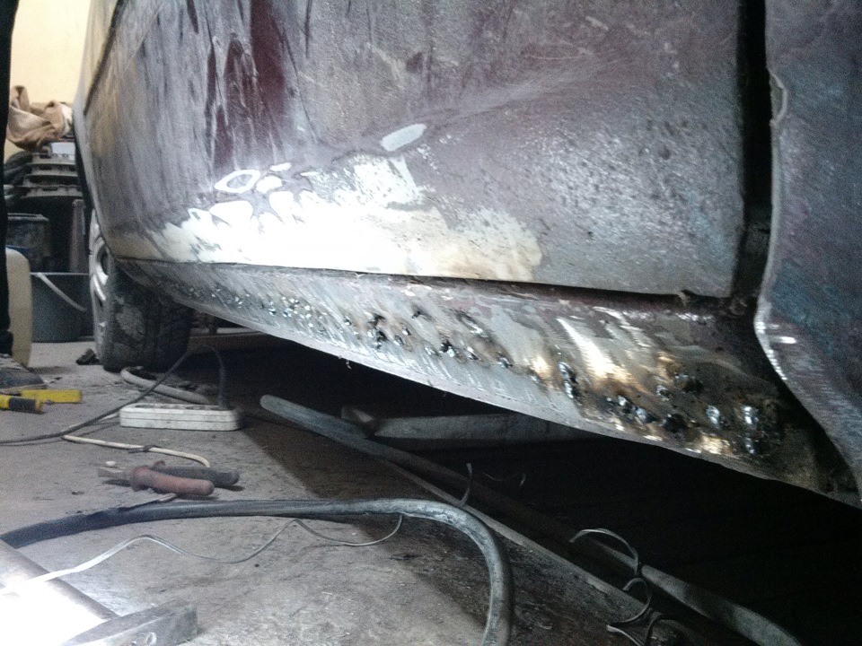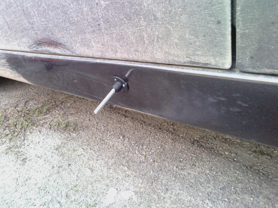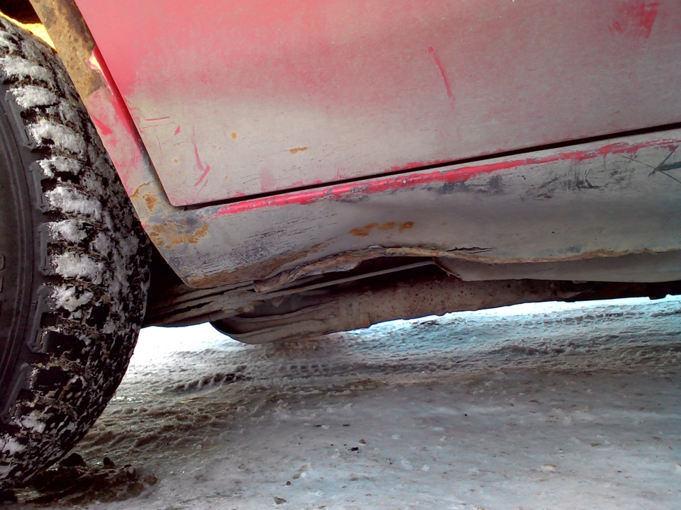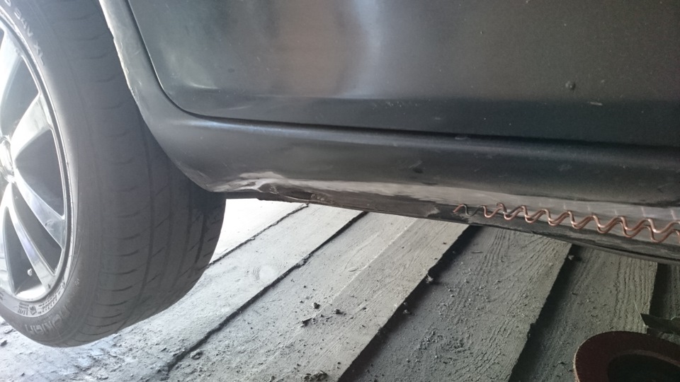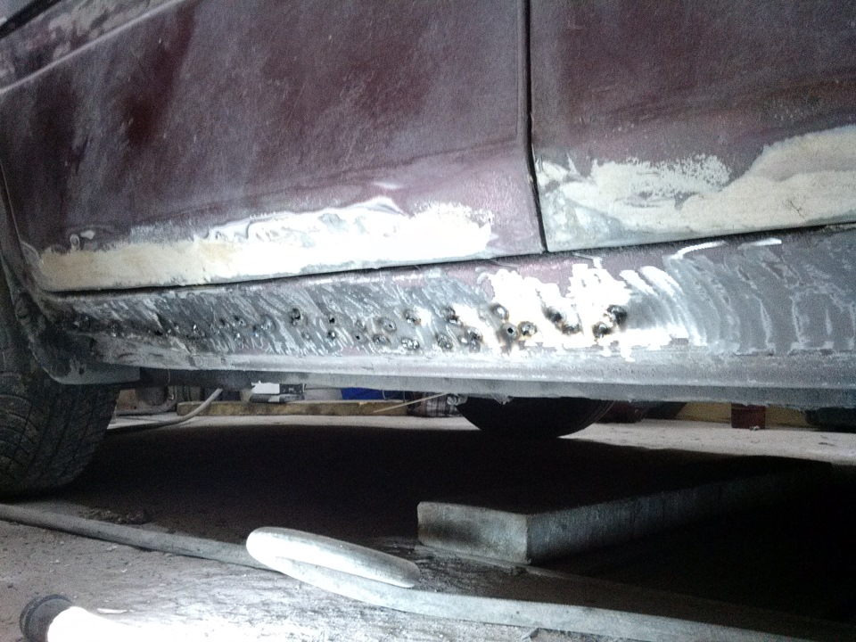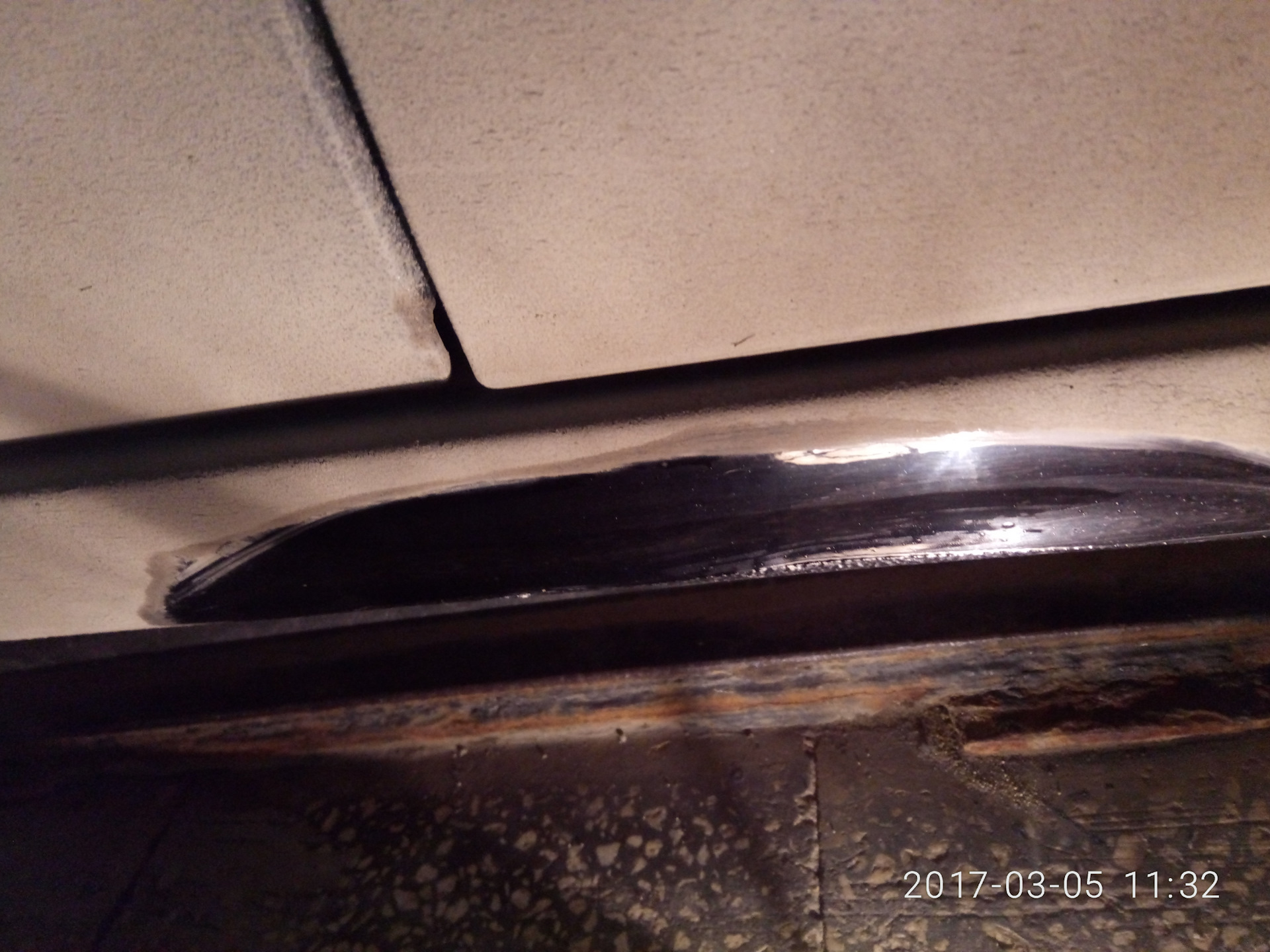 Один его конец можно упереть в жёсткую часть днища машины (лонжерон вдоль днища), подложив доску или брусок нужной толщины. Другим концом нужно постепенно нажимать вниз. Так можно выправить нижнюю деформацию порога. Подобным образом можно выправлять и боковую деформацию, только нужно придумать боковой упор для рычага. К примеру, можно доску нужной длины, пропустив её под машиной, упереть в стену гаража, а в её край упереть рычаг. - После использования сварки, внутреннюю часть порога нужно обработать антикоррозионным средством через технологические отверстия в нём, которые закрыты резинками. Можно распылить эпоксидный грунт через специальную трубку с форсункой, распыляющей на 360 градусов. Такая трубка обычно есть в комплекте с мовилем. Если после сварки не обработать внутреннюю часть порога, то металл будет ржаветь изнутри достаточно быстро.
