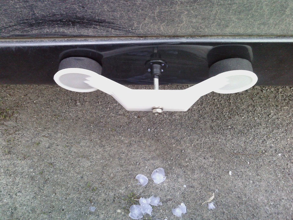 Плавную вмятину, не содержащую острых складок, можно выправить при помощи вытягивающего устройства и горячего клея. Подобный принцип используется в клеевой системе технологии беспокрасочного ремонта вмятин PDR. Устройство для вытягивания можно сделать самому из деревянных брусков и длинного болта с гайкой и шайбами (см. фото). Брусок с болтом приклеивается к самой глубокой части вмятины, после чего болт постепенно закручивается и тянет за собой приклеенный брусок.