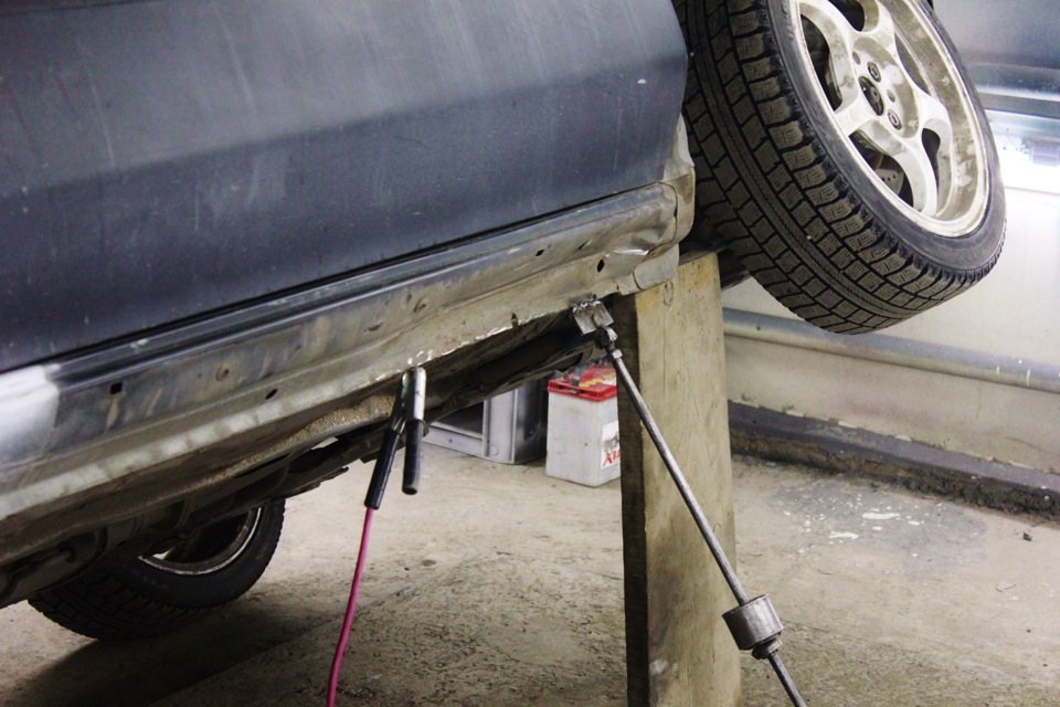 - Если есть возможность закрепить цепь к полу гаража или другой нижней части (приварить петлю к металлическому уголку, к примеру, которым обрамляют смотровую яму), то можно использовать следующий способ. К деформированным местам можно приваривать металлические петли или пластины с петлями, за них и за нижнюю часть гаража цеплять цепь и поднимать машину домкратом. Вмятина будет выправляться по мере поднятия домкрата. Таким способом можно выправить замятую отбортовку порога, которая очень жёсткая и не податливая при выправлении.