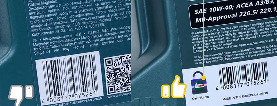 С Августа 2016-го года компания Castrol внедрила надежную защиту продукции в виде уникального кода на голограмме на каждой 4-х и 5-ти литровой канистре, а также картонных коробках (для литровой тары, 12х1л) и бочковой продукции, позволяющей проверить оригинальность.