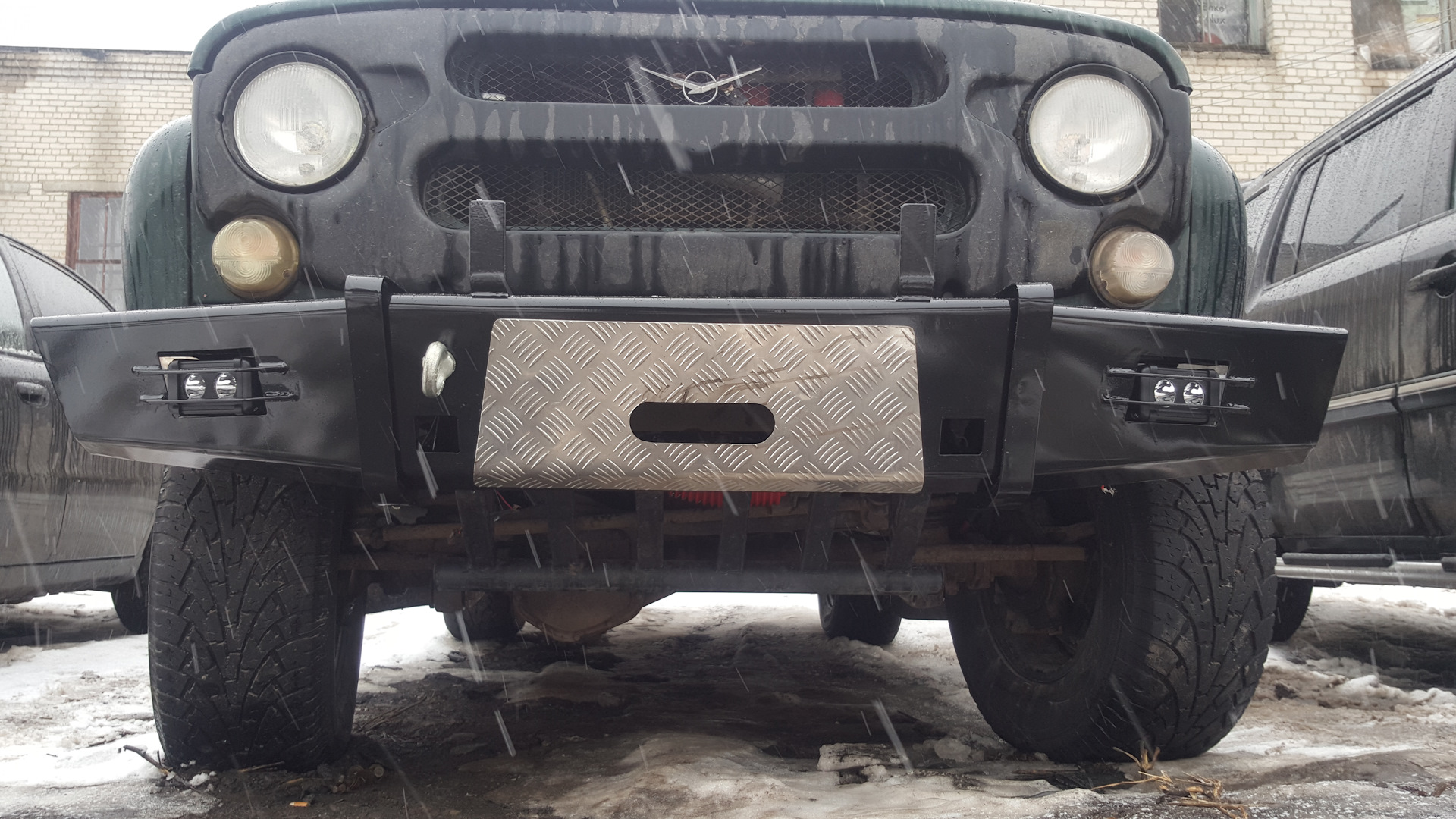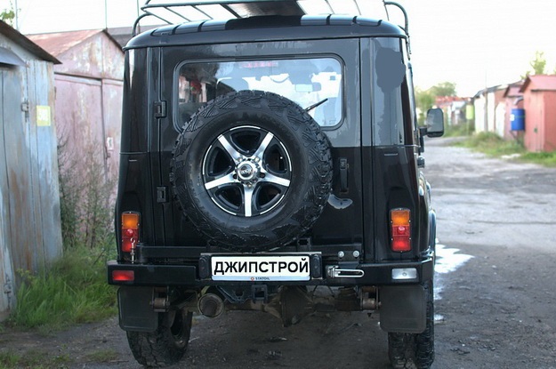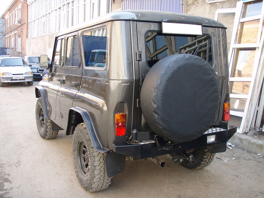 Заводской бампер УАЗ имеет достаточно грубую, угловатую форму. На нем крепится табличка с номером и зацепы для буксировки. В целом, облик передней части выходит органичным и однообразным.