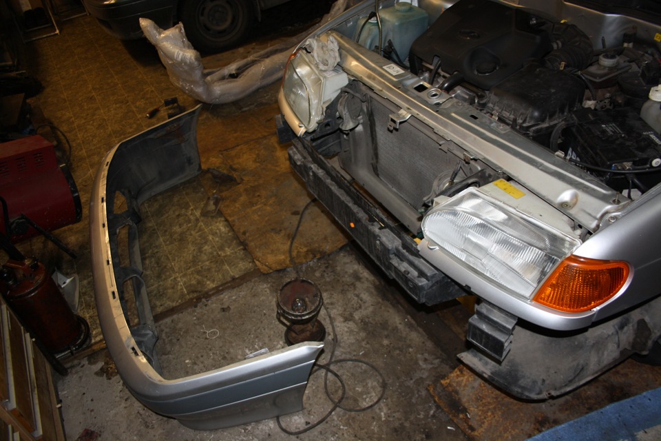 - Снятие освобожденного от креплений бампера.