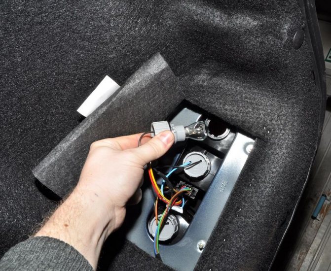 Поворачиваем патрон лампы сигнала торможения и габаритного света против часовой стрелки, вынимаем патрон с лампой из корпуса