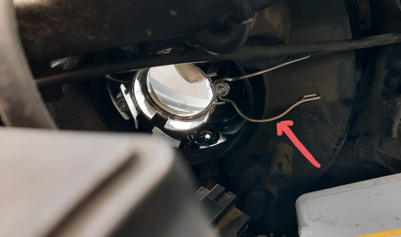 - Лампочка фиксируется пружинным держателем — чтобы отпустить, наденьте на верхнюю часть;