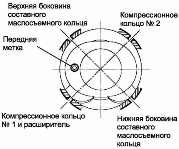 - замок маслосъемного кольца ставим на 90° относительно замков других колец. При этом стык его расширителя должен находиться с противоположной стороны замка самого кольца.